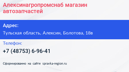 Алексинагропромснаб, магазин автозапчастей по адресу Тульская область, Алексин, Болотова, 18в в дальнейшем Организация, размещена в следующих категориях: