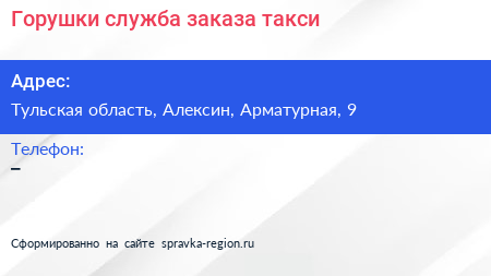 Горушки, служба заказа такси по адресу Тульская область, Алексин, Арматурная, 9 в дальнейшем Организация, размещена в следующих категориях:
