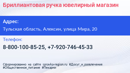 Бриллиантовая ручка, ювелирный магазин по адресу Тульская область, Алексин, улица Мира, 20 в дальнейшем Организация, размещена в следующих категориях: