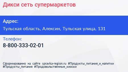 Дикси, сеть супермаркетов по адресу Тульская область, Алексин, Тульская улица, 131 в дальнейшем Организация, размещена в следующих категориях: