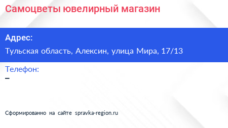 Самоцветы, ювелирный магазин по адресу Тульская область, Алексин, улица Мира, 17/13 в дальнейшем Организация, размещена в следующих категориях: