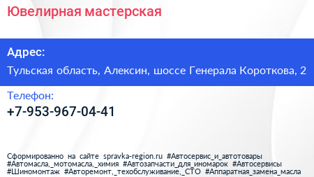 Ювелирная мастерская по адресу Тульская область, Алексин, шоссе Генерала Короткова, 2 в дальнейшем Организация, размещена в следующих категориях: