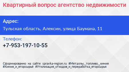 Квартирный вопрос, агентство недвижимости по адресу Тульская область, Алексин, улица Баумана, 11 в дальнейшем Организация, размещена в следующих категориях: