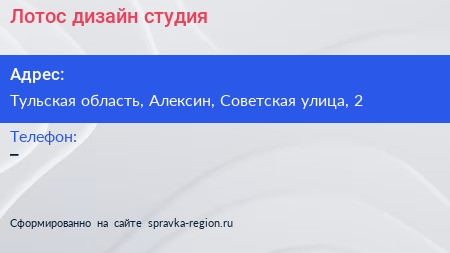 Лотос, дизайн-студия по адресу Тульская область, Алексин, Советская улица, 2 в дальнейшем Организация, размещена в следующих категориях: