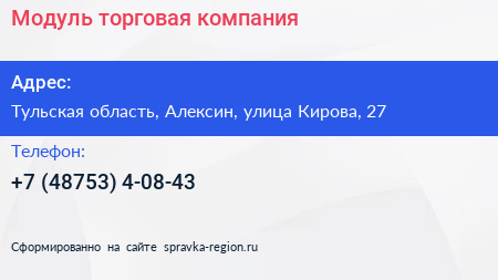 Модуль, торговая компания по адресу Тульская область, Алексин, улица Кирова, 27 в дальнейшем Организация, размещена в следующих категориях: