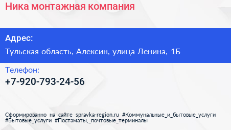 Ника, монтажная компания по адресу Тульская область, Алексин, улица Ленина, 1Б в дальнейшем Организация, размещена в следующих категориях: