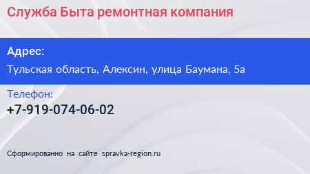 Служба Быта, ремонтная компания по адресу Тульская область, Алексин, улица Баумана, 5а в дальнейшем Организация, размещена в следующих категориях: