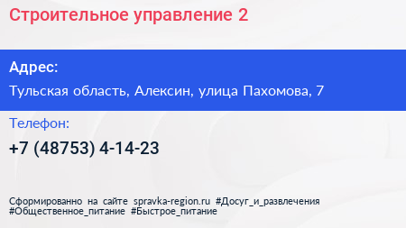 Строительное управление №2 по адресу Тульская область, Алексин, улица Пахомова, 7 в дальнейшем Организация, размещена в следующих категориях: