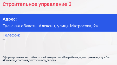 Строительное управление №3 по адресу Тульская область, Алексин, улица Матросова, 9а в дальнейшем Организация, размещена в следующих категориях: