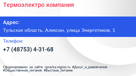 Термоэлектро, компания по адресу Тульская область, Алексин, улица Энергетиков, 1 в дальнейшем Организация, размещена в следующих категориях: