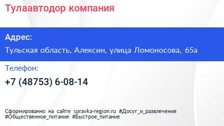 Тулаавтодор, компания по адресу Тульская область, Алексин, улица Ломоносова, 65а в дальнейшем Организация, размещена в следующих категориях: