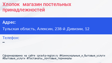 Хлопок+, магазин постельных принадлежностей по адресу Тульская область, Алексин, 238-й Дивизии, 12 в дальнейшем Организация, размещена в следующих категориях: