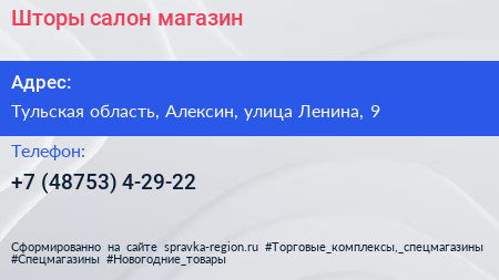 Шторы, салон-магазин по адресу Тульская область, Алексин, улица Ленина, 9 в дальнейшем Организация, размещена в следующих категориях: