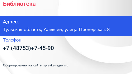 Библиотека по адресу Тульская область, Алексин, улица Пионерская, 8 в дальнейшем Организация, размещена в следующих категориях: