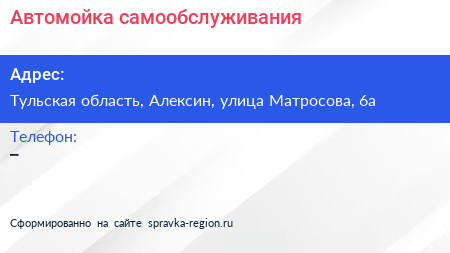 Автомойка самообслуживания по адресу Тульская область, Алексин, улица Матросова, 6а в дальнейшем Организация, размещена в следующих категориях: