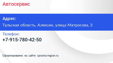 Автосервис по адресу Тульская область, Алексин, улица Матросова, 3 в дальнейшем Организация, размещена в следующих категориях: