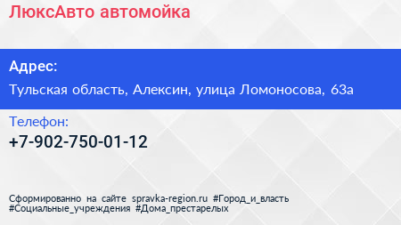 ЛюксАвто, автомойка по адресу Тульская область, Алексин, улица Ломоносова, 63а в дальнейшем Организация, размещена в следующих категориях: