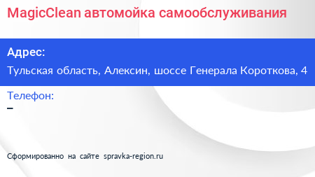 MagicClean, автомойка самообслуживания по адресу Тульская область, Алексин, шоссе Генерала Короткова, 4 в дальнейшем Организация, размещена в следующих категориях: