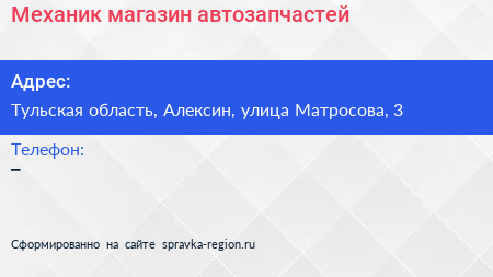 Механик, магазин автозапчастей по адресу Тульская область, Алексин, улица Матросова, 3 в дальнейшем Организация, размещена в следующих категориях: