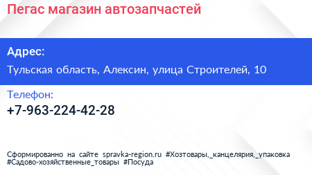 Пегас, магазин автозапчастей по адресу Тульская область, Алексин, улица Строителей, 10 в дальнейшем Организация, размещена в следующих категориях:
