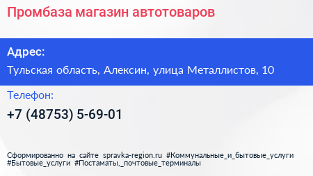 Промбаза, магазин автотоваров по адресу Тульская область, Алексин, улица Металлистов, 10 в дальнейшем Организация, размещена в следующих категориях: