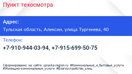 Пункт техосмотра по адресу Тульская область, Алексин, улица Тургенева, 40 в дальнейшем Организация, размещена в следующих категориях: