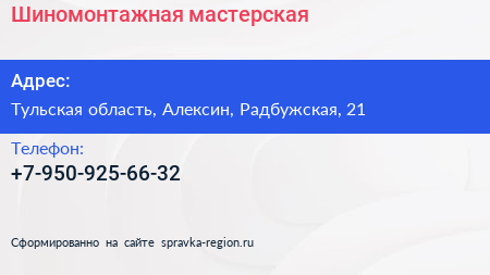 Шиномонтажная мастерская по адресу Тульская область, Алексин, Радбужская, 21 в дальнейшем Организация, размещена в следующих категориях: