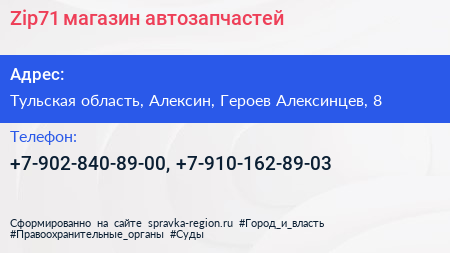 Zip71, магазин автозапчастей по адресу Тульская область, Алексин, Героев Алексинцев, 8 в дальнейшем Организация, размещена в следующих категориях: