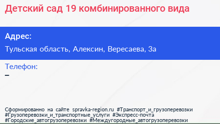 Детский сад №19 комбинированного вида по адресу Тульская область, Алексин, Вересаева, 3а в дальнейшем Организация, размещена в следующих категориях: