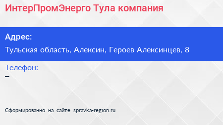 ИнтерПромЭнерго Тула, компания по адресу Тульская область, Алексин, Героев Алексинцев, 8 в дальнейшем Организация, размещена в следующих категориях: