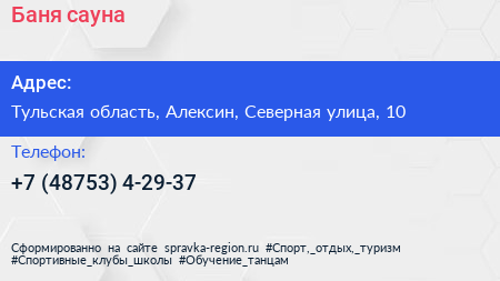 Баня-сауна по адресу Тульская область, Алексин, Северная улица, 10 в дальнейшем Организация, размещена в следующих категориях: