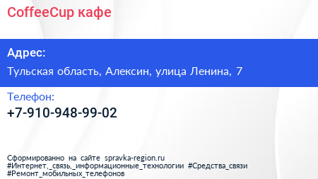 CoffeeCup, кафе по адресу Тульская область, Алексин, улица Ленина, 7 в дальнейшем Организация, размещена в следующих категориях: