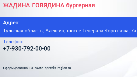 ЖАДИНА ГОВЯДИНА, бургерная по адресу Тульская область, Алексин, шоссе Генерала Короткова, 7а в дальнейшем Организация, размещена в следующих категориях:
