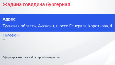 Жадина говядина, бургерная по адресу Тульская область, Алексин, шоссе Генерала Короткова, 4 в дальнейшем Организация, размещена в следующих категориях: