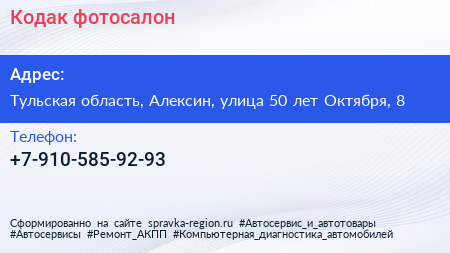 Кодак, фотосалон по адресу Тульская область, Алексин, улица 50 лет Октября, 8 в дальнейшем Организация, размещена в следующих категориях:
