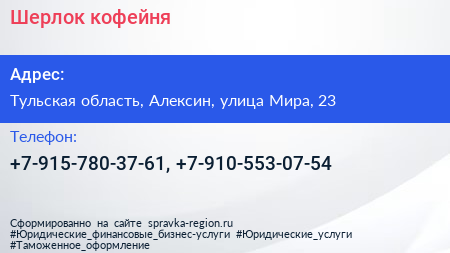 Шерлок, кофейня по адресу Тульская область, Алексин, улица Мира, 23 в дальнейшем Организация, размещена в следующих категориях: