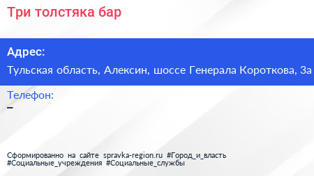 Три толстяка, бар по адресу Тульская область, Алексин, шоссе Генерала Короткова, 3а в дальнейшем Организация, размещена в следующих категориях: