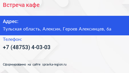 Встреча, кафе по адресу Тульская область, Алексин, Героев Алексинцев, 6а в дальнейшем Организация, размещена в следующих категориях: