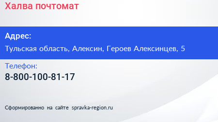 Халва, почтомат по адресу Тульская область, Алексин, Героев Алексинцев, 5 в дальнейшем Организация, размещена в следующих категориях: