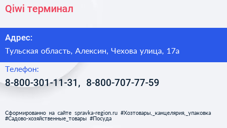 Qiwi, терминал по адресу Тульская область, Алексин, Чехова улица, 17а в дальнейшем Организация, размещена в следующих категориях: