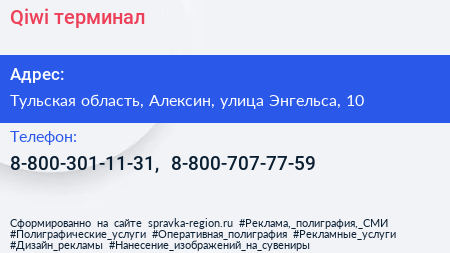 Qiwi, терминал по адресу Тульская область, Алексин, улица Энгельса, 10 в дальнейшем Организация, размещена в следующих категориях: