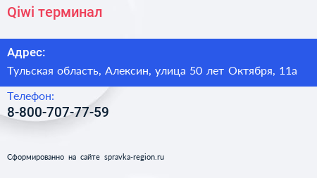 Qiwi, терминал по адресу Тульская область, Алексин, улица 50 лет Октября, 11а в дальнейшем Организация, размещена в следующих категориях: