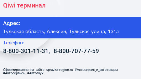 Qiwi, терминал по адресу Тульская область, Алексин, Тульская улица, 131а в дальнейшем Организация, размещена в следующих категориях: