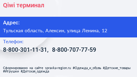 Qiwi, терминал по адресу Тульская область, Алексин, улица Ленина, 12 в дальнейшем Организация, размещена в следующих категориях:
