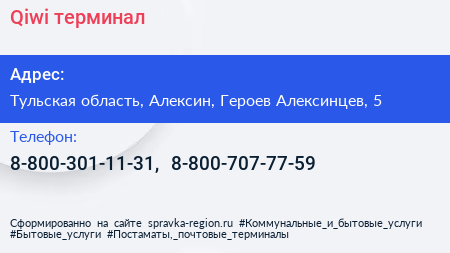 Qiwi, терминал по адресу Тульская область, Алексин, Героев Алексинцев, 5 в дальнейшем Организация, размещена в следующих категориях: