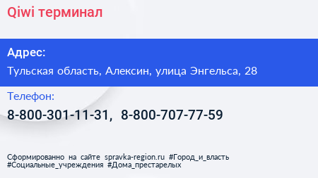 Qiwi, терминал по адресу Тульская область, Алексин, улица Энгельса, 28 в дальнейшем Организация, размещена в следующих категориях: