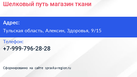 Шелковый путь, магазин ткани по адресу Тульская область, Алексин, Здоровья, 9/15 в дальнейшем Организация, размещена в следующих категориях: