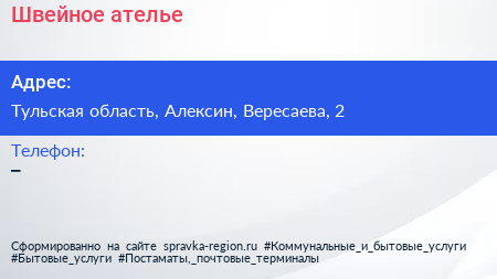 Швейное ателье по адресу Тульская область, Алексин, Вересаева, 2 в дальнейшем Организация, размещена в следующих категориях: