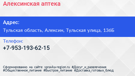 Алексинская аптека по адресу Тульская область, Алексин, Тульская улица, 136Б в дальнейшем Организация, размещена в следующих категориях: