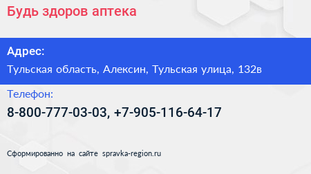 Будь здоров, аптека по адресу Тульская область, Алексин, Тульская улица, 132в в дальнейшем Организация, размещена в следующих категориях: